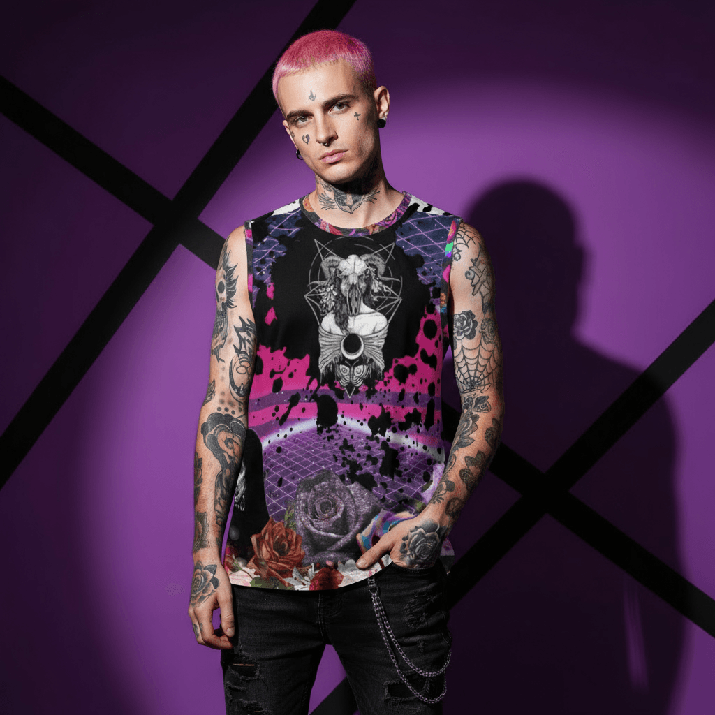 Shop men's Lachrywave alternative fashion. Dark aesthetic streetwear, vaporwave hoodies, neon-punk tees & hip hop trends. From Lachrymal Gems.